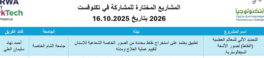 تأهل مشروع "TIJAN" من إعداد الطالبين: أحمد سليمان علي وإبراهيم البدوي و بإشراف الدكتورة عفاف الشلبي و المهندسة نور الحكيم ليحصد المرتبة الأولى ضمن المشاريع المرشحة للمشاركة في مسابقة تكنوفيست الدولية في تركيا.
