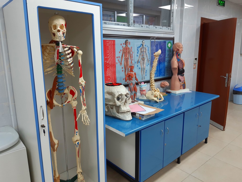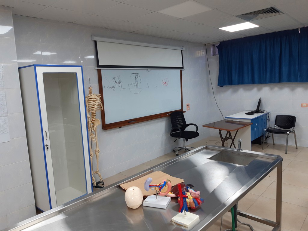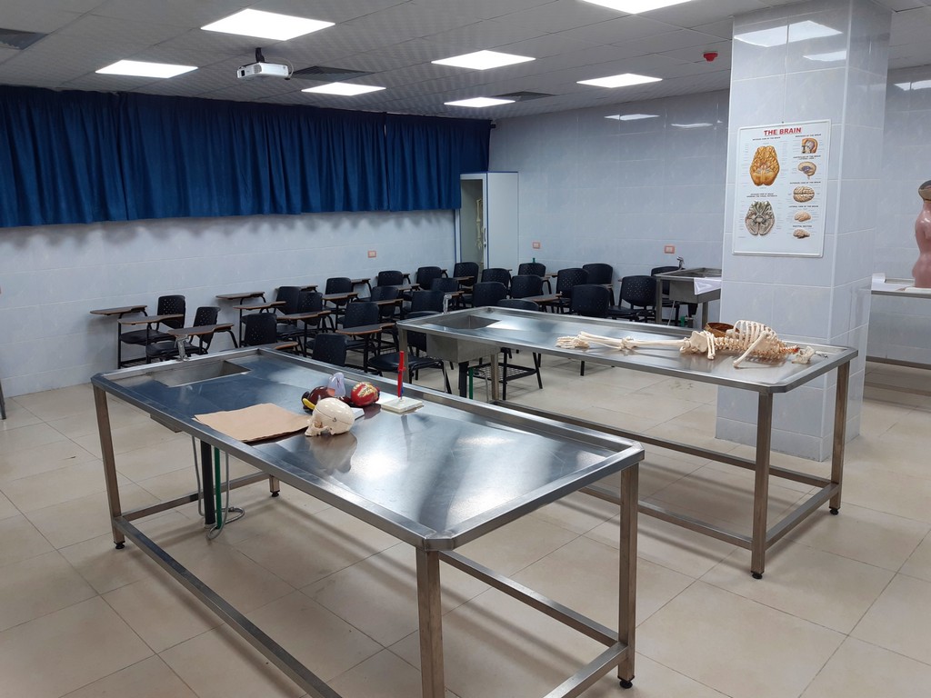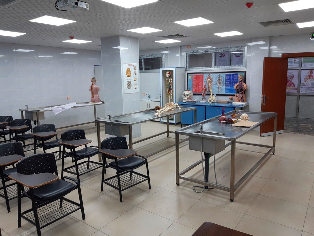 يتم التدريس والبحث والتشريح لجميع أجهزة الجسم (يكل عظمي – قفص صدري – جهاز عصبي مركزي ونخاع شوكي – جهاز الدوران والقلب والرئتين – جهاز الهضم بأقسامه وملحقاته – الحوض) ضمن جلسات العملي موزعة على أربعة مقررات: