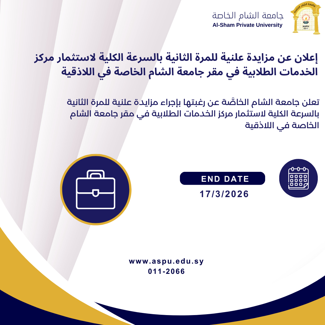 • تقدم العروض إلى ديوان جامعة الشام الخاصة باللاذقية – حي الصليبية حتى الساعة الثانية عشرة ظهراً من يوم الثلاثاء الموافق لـ 24/2/2026.