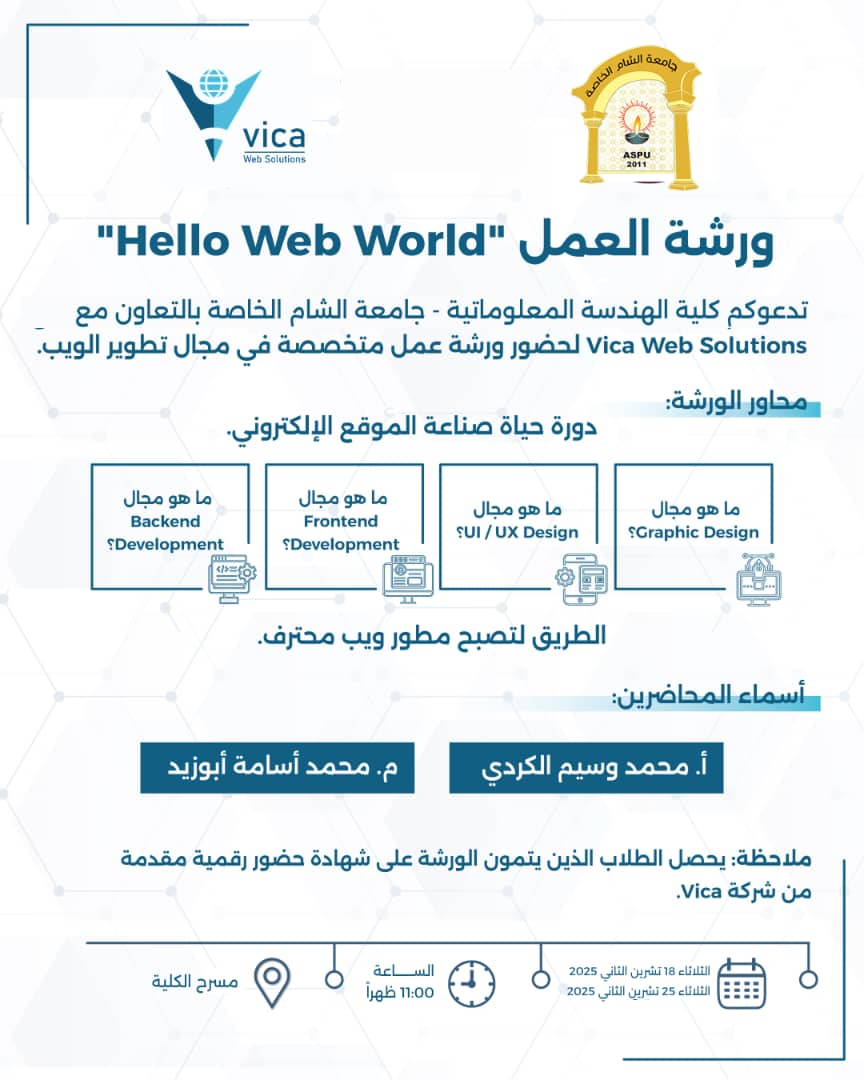 وسط حضور لافت وحماس كبير من طلاب كلية الهندسة المعلوماتية، اختُتمت فعاليات ورشة العمل التخصصية "Hello Web World" التي قدّمتها شركة Vica Web Solutions بإشراف رئيس الجامعة الأستاذ الدكتور عبد المنعم عبد الحافظ ودعم مباشر من إدارة الكلية.