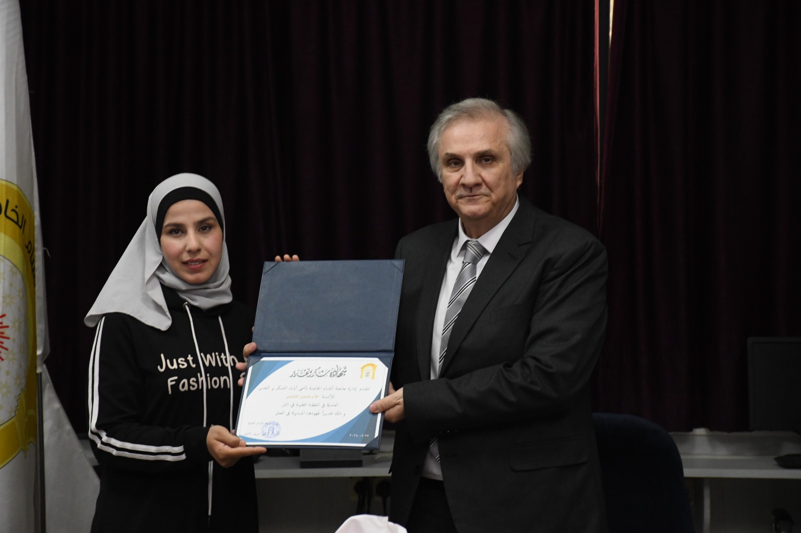افتتحت الجلسة بالترحيب بالسادة أعضاء المجلس وتماشياً مع سياسة الجامعة بتشجيع وتقدير العاملين لديها، فقد تم تكريم الآنسة الاء ناصر الناصر العاملة لدى النقطة الطبية في التل.