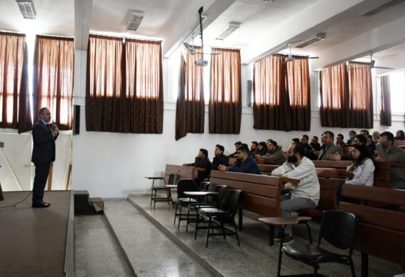 عميد كلية طب الاسنان في جامعة الشام الخاصة كليات دمشق يلقي محاضرة على مدرج كليات الجامعة في اللاذقية